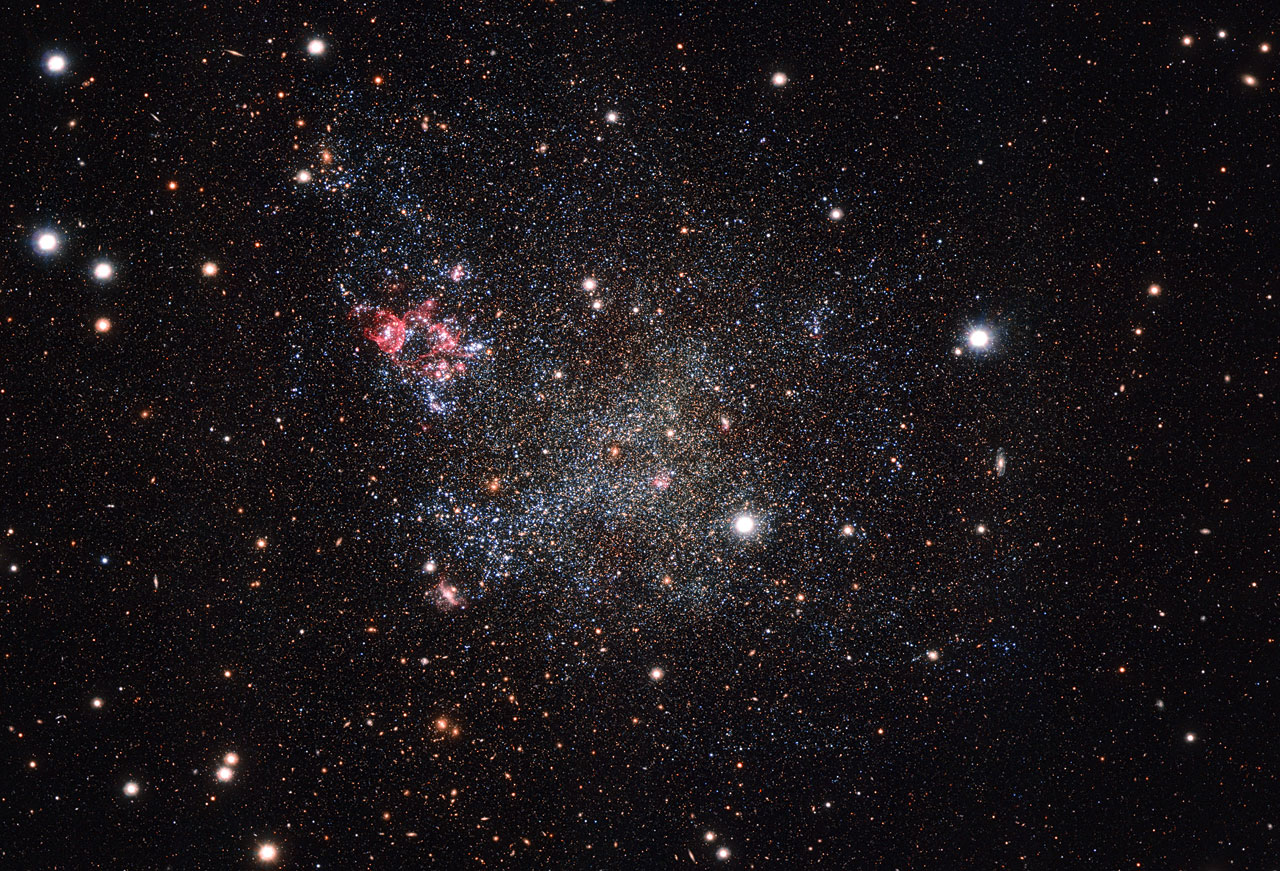 IC 1613 es una galaxia enana de la constelación de Cetus (el monstruo marino). Esta imagen del VST [1] muestra, con gran detalle, la poco convencional belleza de esta galaxia, con todas sus estrellas y el gas rosa brillante esparcidos.