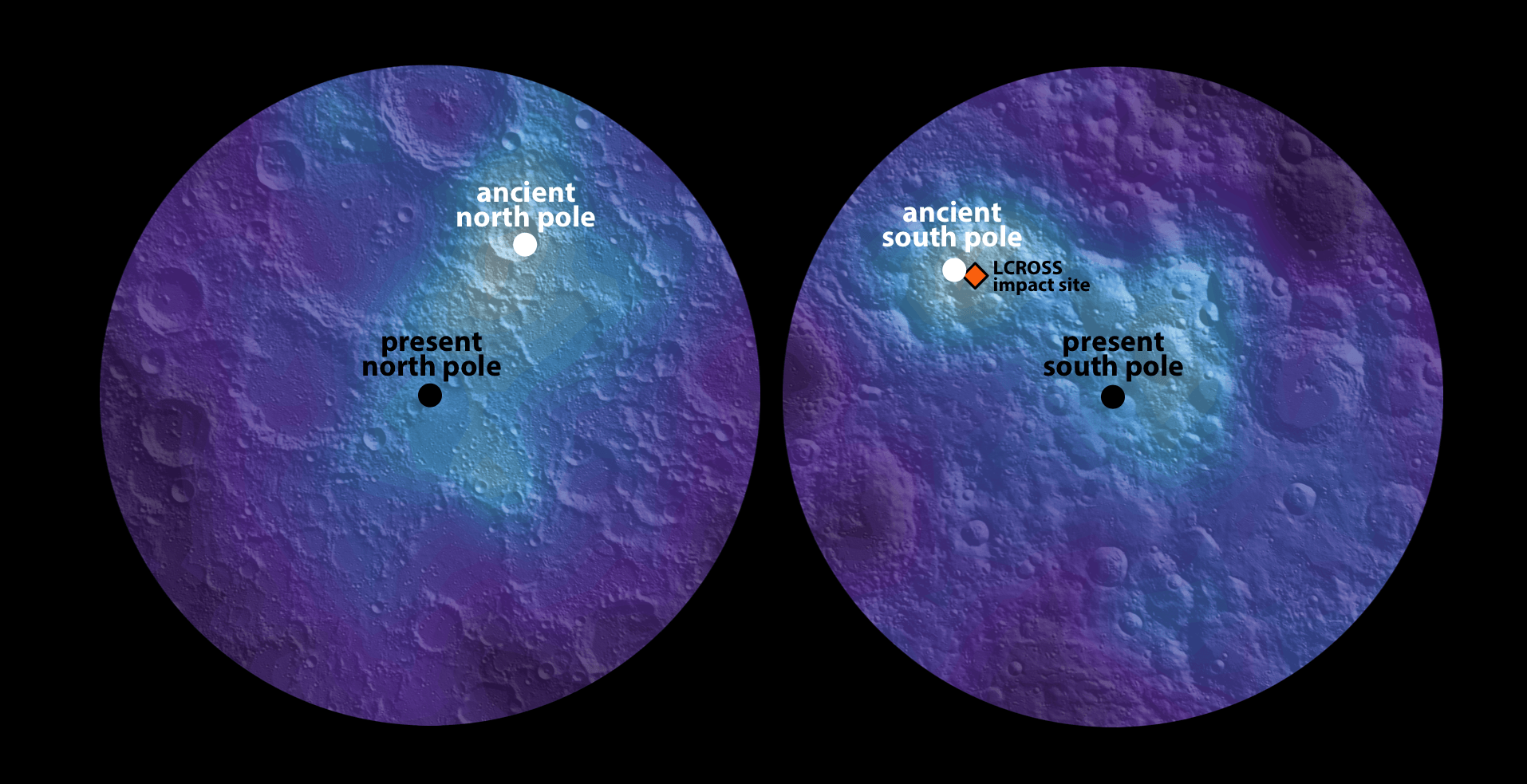 Un extraño desplazamiento del hielo de los polos norte y sur actuales de la Luna era un indicador para Siegler, que armó un equipo de expertos para echar un vistazo más de cerca a los datos recogidos por las misiones de la NASA Lunar Prospector y Lunar Reconnaissance Orbiter. El análisis estadístico y la modelización revelaron que el hielo está desplazado en cada polo la misma distancia, pero en direcciones exactamente opuestas.