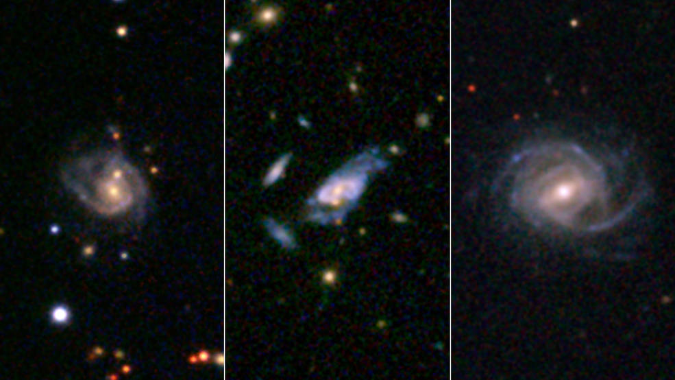 Tres ejemplos de galaxias super espirales son presentados en estas imágnenes tomadas por el Sloan Digital Sky Survey (SDSS). Otros ejemplos se muestran abajo. Crédito: NASA, SDSS