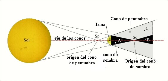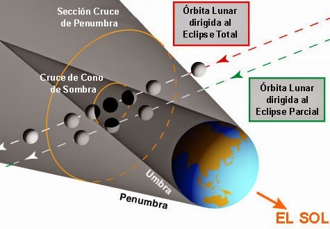 Abajo izquierda: cómo se forman los conos de Sombra proyectados por la Tierra:el cono de sombra total (umbra ) y rodeándolo el cono de sombra parcial (penumbra).