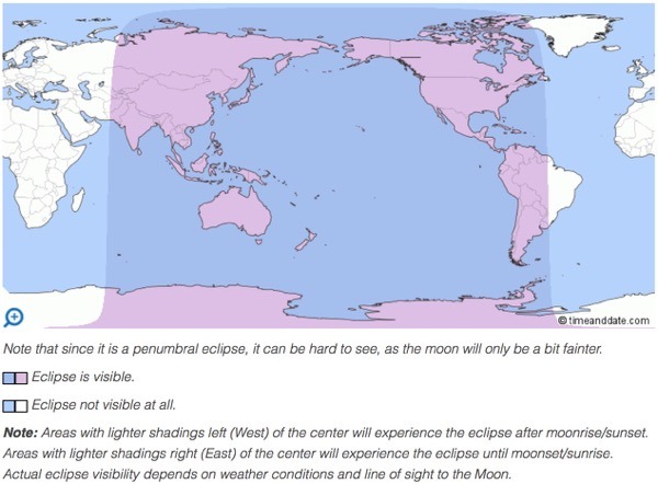Otras regiones que ven la totalidad o parte del eclipse incluyen gran parte de Asia, Australia, gran parte de América del Sur, el Atlántico, el Océano Índico, el Ártico y la Antártida. Etso es porque, a diferencia de un eclipse solar – que es visible desde una parte relativamente pequeña de la Tierra – cada eclipse lunar es visible desde todo el hemisferio de la Tierra hacia la Luna, mientras que el eclipse tiene lugar.