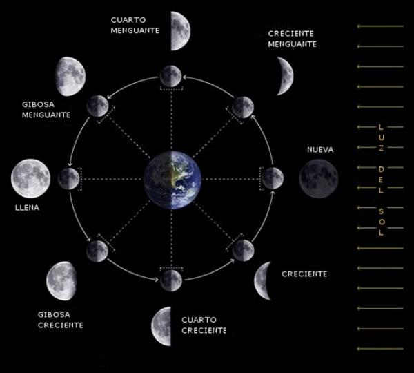 Arriba: Diagrama de las fases lunares, mostrando que cuando ocurrela alineación Luna Tierra, Sol en ese orden, corresponde a la fase de Luna Llena. Crédito imagen: COMO Educación.