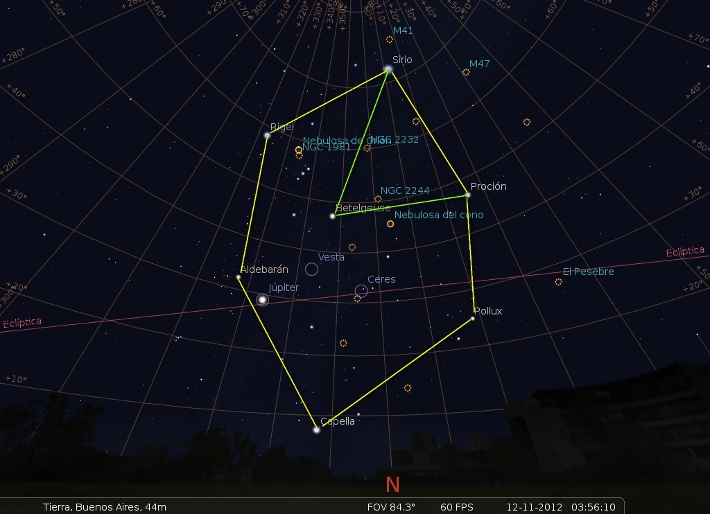 El Círculo de invierno – a veces llamado el Hexágono de Invierno – no es una de las 88 constelaciones reconocidas. Más bien, es un asterismo – un modelo de estrellas que es bastante fácil de reconocer. Nuestro mapa del cielo no puede transmitir adecuadamente el tamaño descomunal del Círculo de invierno! Empequeñece la constelación de Orión, el cazador, que es una constelación bastante grande, que ocupa la parte suroeste del patrón del círculo de invierno.