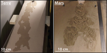 La posible presencia de agua líquida en la superficie de Marte es una cuestión clave en la búsqueda de entornos potencialmente favorables para la vida. Hasta ahora, la detección de agua líquida depende de la identificación de morfologías similares a los producidas en la Tierra por el flujo de agua líquida, como los canales, barrancos, o simplemente la aparición estacional de huellas oscuras causadas por humedecimiento de la superficie. Sin embargo, los flujos producidos en el laboratorio muestran que las morfologías producidas bajo las condiciones marcianas son muy diferentes de las terrestres . La comparación directa entre los accidentes geográficos producidos en la Tierra y en Marte por lo tanto, no parece ser apropiada para detectar la aparición de un líquido en Marte, alterando de este modo nuestra interpretación de la superficie de Marte. Más información en el sitio web de noticias CNRS .