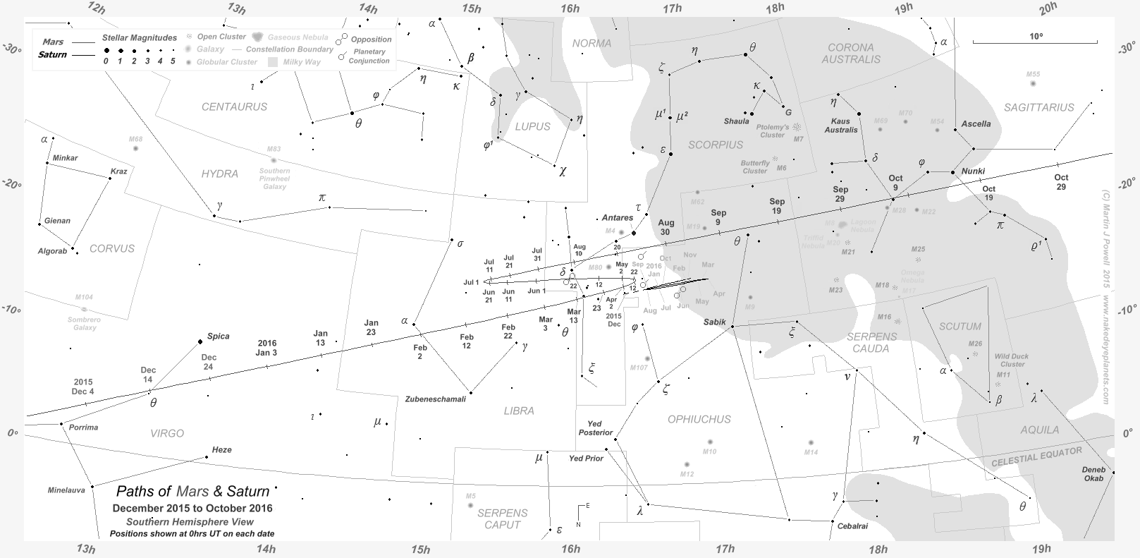 El camino de Marte sobre el fondo de estrellas del Zodiaco del Sur entre Diciembre del 2015 y Octubre del 2016, se muestra marcando las posiciones a intervalos de 10 días. Durante esta aparición, Marte describe un trazo en zig-zag hacia el sur sobre el fondo de estrellas , a diferencia del bucle “híbrido” que describió en la aparición anterior del planeta en el período 2013-15 . El camino de Saturno en el sur de Ofiuco está también marcado al principio de cada mes durante el mismo período (2015-2016); los dos planetas se acercan entre sí en el cielo de la tarde a finales de Agosto del 2016 (para más detalles ver las conjunciones planetarias sección a continuación ). El mapa de las estrellas es para los observadores en el Hemisferio Sur (es decir el Polo Celeste Sur está hacia arriba). Las estrellas más débiles que se muestran en el mapa tienen una magnitud aparente de aproximadamente 4,8. Versiones de fácil impresión de esta tabla están disponibles para los del Norte y del Sur vistas del hemisferio. Las coordenadas astronómicas: ascensión recta (longitud, medida hacia el Este en horas: minutos) y declinación (latitud, medidos en grados norte o sur del Ecuador Celeste ) están marcados alrededor del borde del gráfico. Haga clic aquí para ver un mapa “limpio” de las estrellas de la zona (es decir, sin la ruta del planeta); Los observadores pueden desear utilizar el mapa estelar “limpio” como una ayuda para el trazado de la posición del planeta en una noche específica – en cuyo caso, una versión imprimible se puede encontrar aquí . Fotografías de las constelaciones del Zodiaco del Sur en el cielo nocturno se pueden ver aquí . Crédito: NakedEyePlanets/Martin J. Powell.