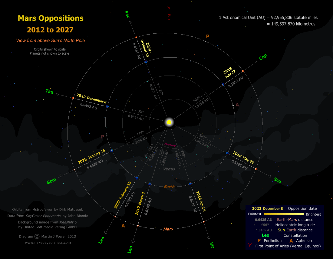 Los puntos denominados perihelio (punto más cercano del planeta al Sol ) y el afelio (su punto más distante del Sol ) están marcados tanto para Marte como para la Tierra con las letras ” P ” y ” A “, respectivamente. En el año 2012 se vio a Marte colocado casi en la peor posición orbital posible cuando se ve desde la Tierra, el planeta estaba pasando por el afelio de su órbita sólo dos semanas antes de la oposición. La oposición del 2027 – 15 años después – será igualmente pobre, estando situado a la misma distancia angular (longitud heliocéntrica) del afelio del planeta.