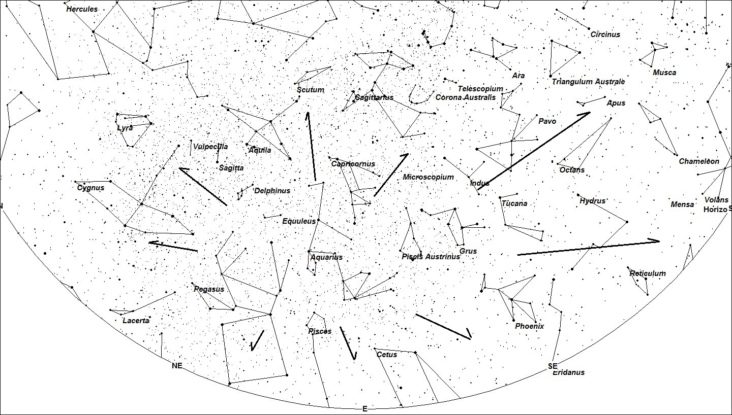 Mapa del cielo para el Hemisferio Sur, las flechas indican la lluvia meteórica saliendo, en forma aparente de la radiante en las inmediaciones de Eta Acuario- Constelación de Acuario – “Signo de la Paz”