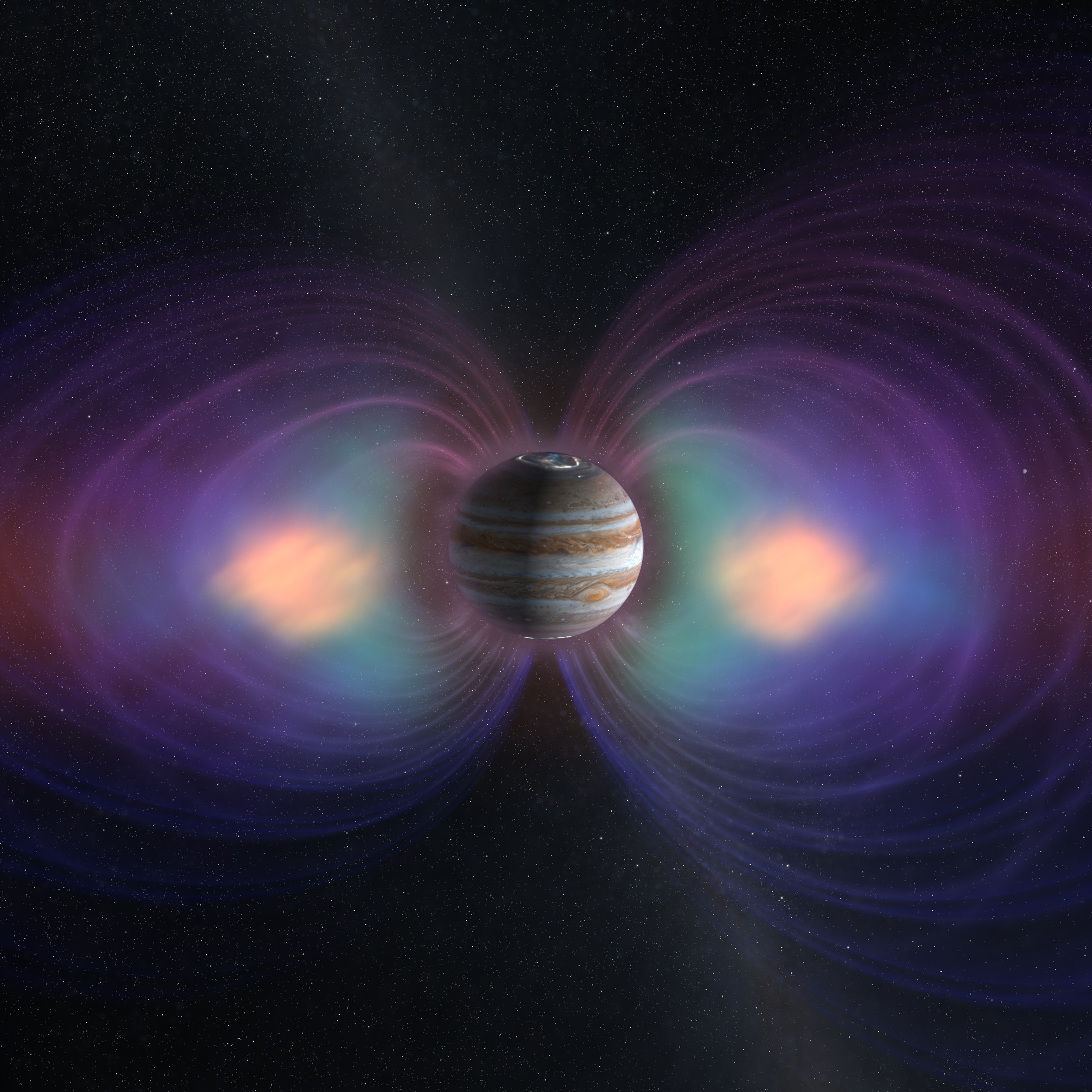 La magnetósfera de Júpiter. Júpiter se muestra con varios componentes importantes de su magnetosfera en la representación de este artista. El campo magnético del planeta está representado por líneas de color púrpura blandos que conectan los polos magnéticosel norte y sur . Las brillantes auroras de Júpiter  se ven en los polos, mientras que las áreas brillantes a la izquierda y a la derecha del ecuador del planeta representan las regiones de radiación de partículas cargadas más intensas – los cinturones de radiación internos de Júpiter. La nave espacial Juno en términos generales, realizará su paso, entre el planeta y las zonas más intensas de radiación. En esta representación se visualiza sólo la parte interior de la magnetósfera. La magnetósfera joviana completa es una enorme estructura, en forma de renacuajo que envuelve a  Júpiter, hasta una distancia de docenas de veces el diámetro del planeta. En la dirección lejos del Sol, la cola magnética se extiende hasta la órbita de Saturno. Crédito: NASA / JPL. Ver videos aquí.