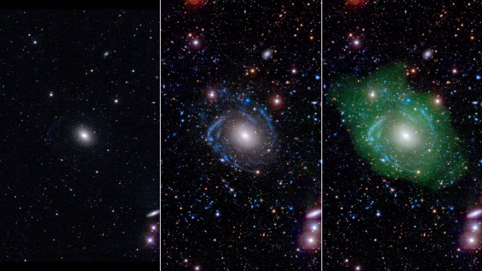 A la izquierda, la imagen de UGC 1382 tomada en el rango visible, parece ser un simple galaxia elíptica. Pero los brazos espirales aparecieron cuando los astrónomos la captaron en ultravioleta junto a una imagen en el visible de mayor profundidad (centro). Combinando esta última que con una imagen tomada en el rango de emisión del gas de hidrógeno de baja densidad (en verde a la derecha), los científicos descubrieron que la UGC 1382 es gigantesca. Crédito de la imagen: NASA / JPL / Caltech / SDSS / NRAO / L. Hagen y M. Seibert > ampliar imagen y la leyenda.
