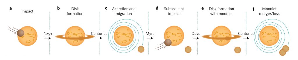 “Es probable que las pequeñas lunas formadas a través del proceso podrían cruzar las órbitas, colisionar y fusionarse”, dijo el autor principal, el profesor Rufo. “Una larga serie de tales colisiones luna- luna poco a poco podría conducir a la formación de una luna mayor- la Luna que vemos hoy en día.”