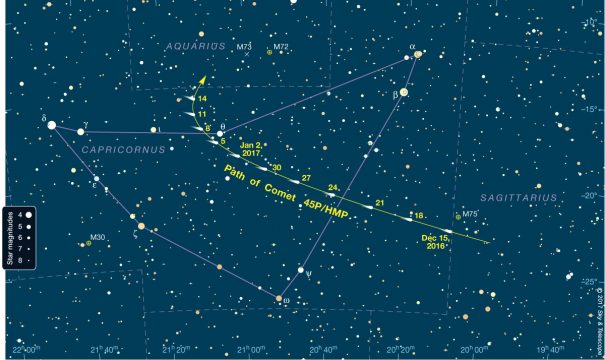 Trayectoria en el cielo del cometa 45P/Honda-Mrkos-Pajdusakova desde mediados de Diciembre del 2016 a mediados de Enero 2017.