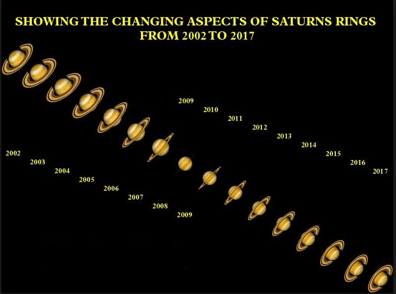 Saturno emplea un poco menos de treinta años en recorrer su órbita alrededor del Sol y durante ese tiempo debido a su eje inclinado la visión de sus anillos  desde la Tierra varía desde no verse cuando quedan de canto a la Tierra, a su máxima expresión cuando se observan en su máxima inclinación relativa, dando asi lugar a un  ciclo de quince años. En la imagen se muestra el ciclo que comenzó en el 2002 (viéndose la parte superior de los anillos ) y culmina en el 2017 (Viéndose la parte inferior de los mismos).