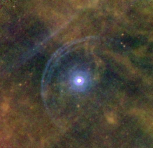 Abajo: Esta imagen infrarroja de Betelgeuse tomada desde el telescopio espacial Herschel muestra dos cáscaras interactuando en un lado de la estrella. (Crédito: L. Decin / Universidad de Lovaina / ESA).