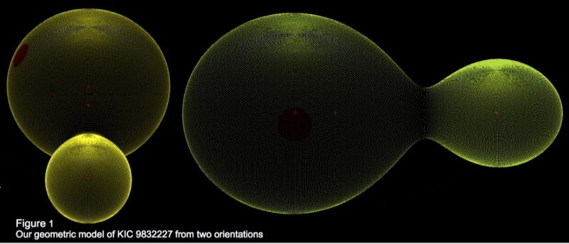Este es el modelo de Larry Molnar del sistema estelar doble KIC 9832227. Las 2 estrellas están tan cerca, que se están tocando. El modelo muestra a la binaria eclipsante tal como se ve desde la Tierra, lo que significa que vemos pasar una estrella en frente de la otra, con cada giro del sistema. Imagen vía Calvin.edu .