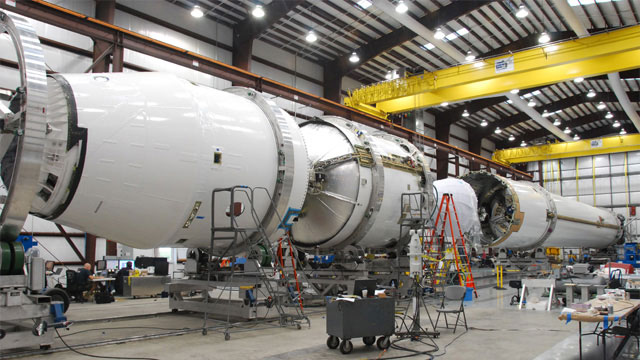 Vista frontal del cohete completo en partes en la Instalación de Ensamblado Horizontal. Crédito: SpaceX.