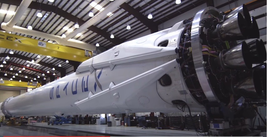 El cohete Falcon 9 encargado de esta misión llegó al  Complejo de Lanzamiento Espacial (SLC-4E), en Noviembre.  Se lo muestra en la Instalación de Integración Horizontal (HIF). Lo que se muestra aquí es la primera etapa del cohete con los nueve propulsores Merlin. Se esperaba inicialmente que esta misión se lanzará en Diciembre. Crédito: SpaceX.