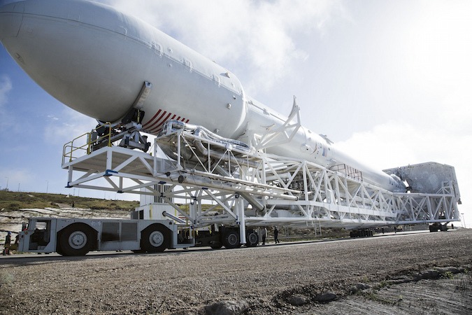 El cohete completo Falcon conteniendo 10 satélites Iridium NEXT en su compartimiento de carga en la parte frontal, es trasladado a la plataforma de lanzamiento en la Base Vandenberg de la Fuerza Aérea en California. Crédito: SpaceX.