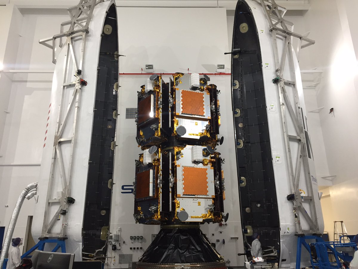Empaque de 10 satélites de la constelación Iridium Next en el contenedor de carga de 13.1 metros de alto y 5.2 metros de diámetro, del cohete Falcon 9 de SpaceX. Crédito: SpaceX.