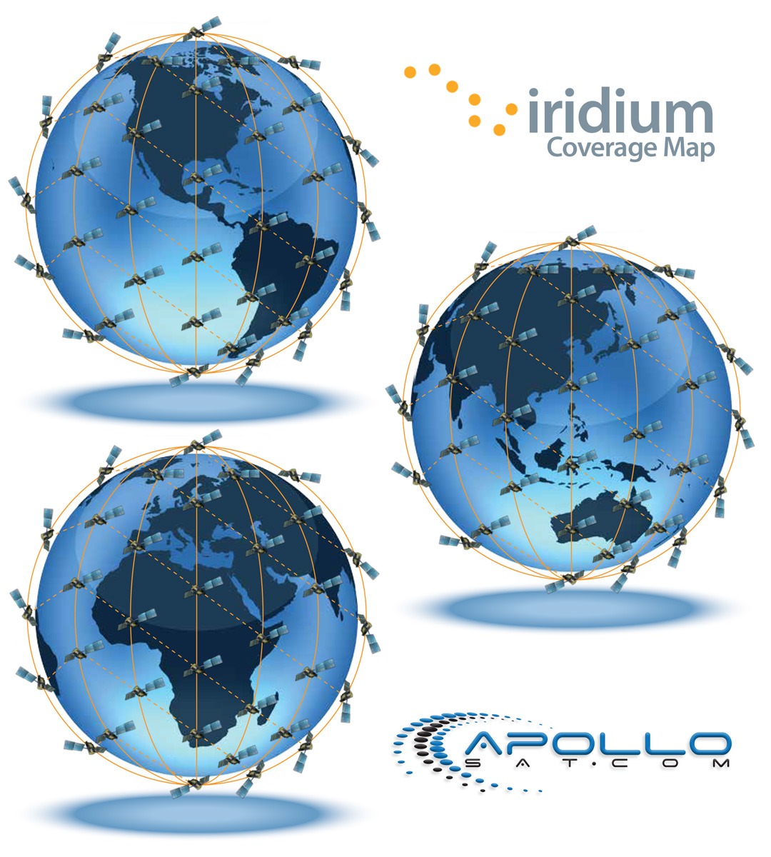 Cobertura Global . SpaceX hará  el lanzamiento de la constelación de satélites Iridium NEXT, con siete cohetes Falcon 9, transportando cada uno10 satélites Iridium . El proyecto total consta de 81 satélites en órbita terrestre baja (Low Earth Orbit, LEO), con 66 activos, seis  de repuesto en órbita y nueve  de repuesto en tierra. Crédito: Iridium NEXT, Apollo Sat.