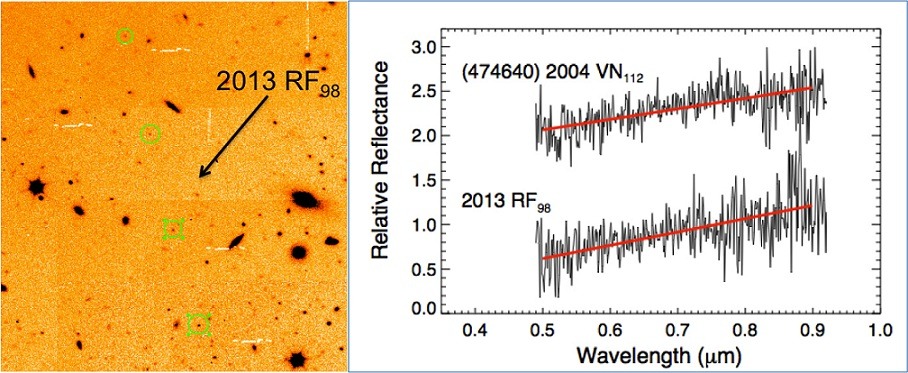 Para llegar a esas conclusiones, hicieron las primeras observaciones espectroscópicas hasta la fecha de 2004 VN112 y 2013 RF98 en el rango visible. Se realizaron, en colaboración con los astrónomos de soporte Gianluca Lombardi y Ricardo Scarpa, usando el espectrógrafo OSIRIS del Gran Telescopio CANARIAS (GTC), ubicado en el Observatorio del Roque de los Muchachos (Garafía, La Palma). Identificar los asteroides fue muy laborioso dado que, al estar tan lejos, su desplazamiento aparente en el cielo es muy lento. Después midieron sus magnitudes aparentes (su brillo intrínseco observado desde la Tierra) y, además, recalcularon la órbita de 2013 RF98, la cual estaba pobremente determinada: los investigadores encontraron el objeto a más un minuto de arco de la posición predicha por las efemérides. Estas observaciones han ayudado a mejorar su órbita y han sido publicadas por el Minor Planet Center (MPEC 2016-U18: 2013 RF98), organismo responsable de la identificación de planetas menores (cometas y asteroides), así como de sus medidas y posiciones orbitales.