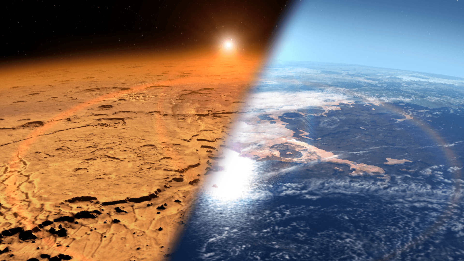 Ilustración del ambiente frío y seco actual en Marte (izquierda) y el que pudo tener en el pasado, con grandes masas de agua líquida y una atmósfera más gruesa. Crédito: NASA’s Goddard Space Flight Center.