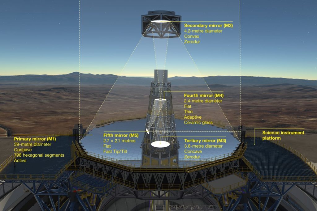 Este diagrama muestra el novedoso sistema óptico de 5-espejos del Extremely Large Telescope de ESO (ELT). Antes de llegar a los instrumentos científicos la luz se refleja en primer lugar en el espejo (M1) gigante cóncavo, segmentado, de 39 metros del telescopio , que luego rebota en dos espejos adicionales de la clase de 4 metros, uno convexo (M2) y una cóncavo (M3). Los últimos dos espejos (M4 y M5) forman un sistema integrado de óptica adaptativa para permitir tomar imágenes extremadamente nítidas que se formen en el plano focal final.