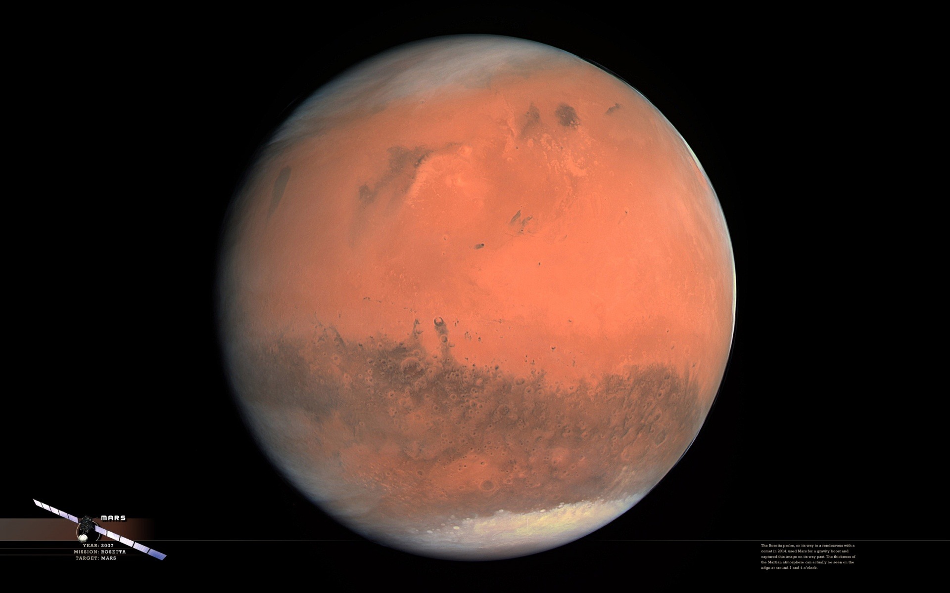 Marte pudo haberse formado cerca de lo que ahora es el Cinturón de Asteroides, mucho más lejos del Sol que los otros planetas rocosos. Esta imagen del planeta rojo fue obtenida por la nave espacial Rosetta al acercarse a Marte para obtener una asistencia gravitatoria en su viaje al cometa 67P/Churyumov-Gerasimenko. Ampliando la imagen se puede observar el velo atmósférico del planeta en las posiciones de la aguja del reloj correspondientes a la 1 y las 4. Crédito de la imagen: ESA & MPS for OSIRIS Team, UPD, LAM, IAA, RSSD, INTA, UPM, DASP, IDA (CC BY-SA 3.0 IGO).