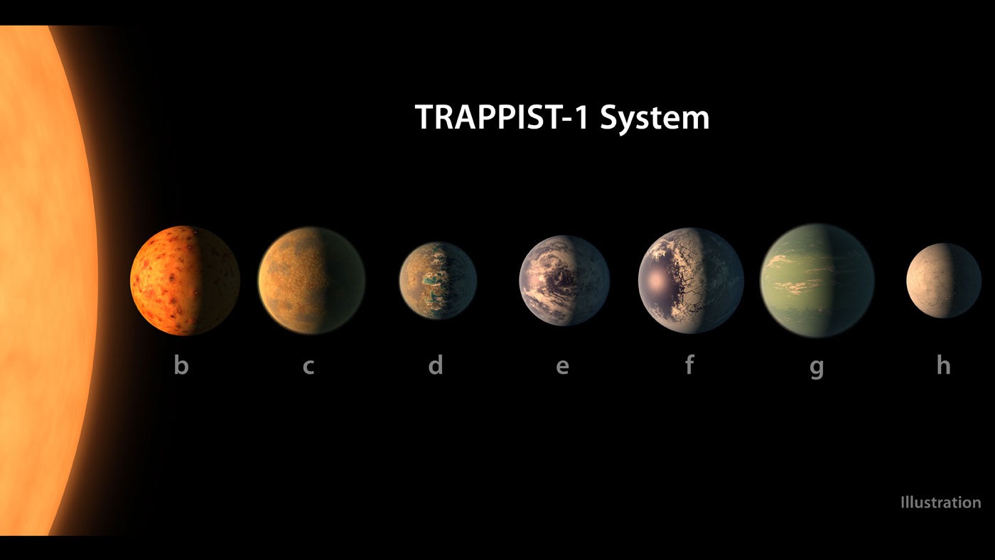Esta representación artística apareció el 23 de Febrero de 2017 en la portada de la revista Nature anunciando que la estrella TRAPPIST-1, una enana ultrafría, tiene siete planetas orbitándola del tamaño de la Tierra. Cualquiera de estos planetas podría tener agua líquida. Los planetas que están más lejos de la estrella son más propensos a tener cantidades significativas de hielo. Image Credit: NASA-JPL/Caltech.