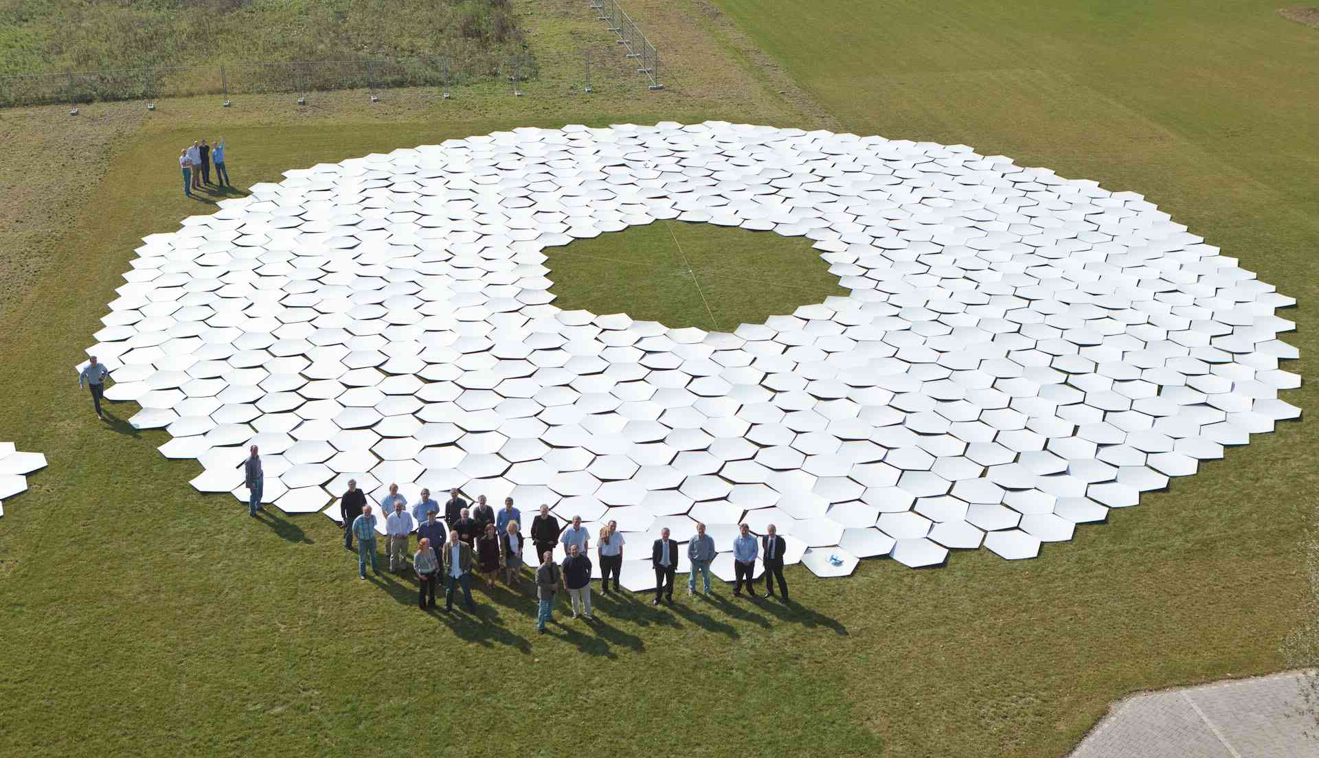La réplica terminada del espejo primario de 39,3 metros de diámetro del E-ELT luego de cuatro horas en las que participaron niños, adultos y voluntarios de ESO, durante el Día de Puertas Abiertas de ESO 2011, en Garching bei München, Alemania. Este modelo a escala real está compuesto por 798 hexágonos de cartón, cada uno con un diámetro de 1,4 metros aproximadamente. El E-ELT será el telescopio óptico/infrarrojo más grande del mundo.  Ver videos: 1, 2, 3.  Más informaciónCrédito: ESO.
