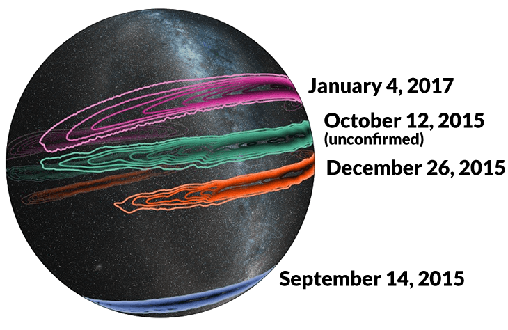 En los tres casos, cada uno de los detectores gemelos de LIGO registraron ondas gravitacionales de las fusiones tremendamente energéticas de pares de agujeros negros. Estas son las colisiones que producen más energía que la que se irradia como luz proveniente de todas las estrellas y las galaxias en el universo en un momento dado. La reciente detección parece ser la más lejana,  con los agujeros negros situados alrededor de 3 mil millones de años luz de distancia de la Tierra. (Los agujeros negros en la primera y segunda detecciones se encontraban a 1,3 y 1,4 mil millones de años luz de distancia de la Tierra, respectivamente).