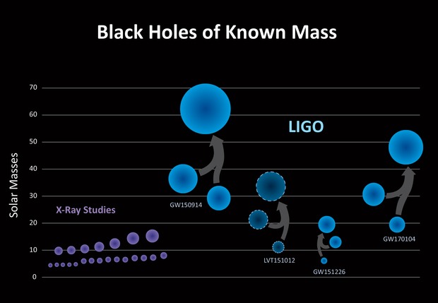 LIGO ha descubierto una nueva población de agujeros negros (color azul) con masas que son más grandes que lo que se había visto antes con los estudios de rayos X solos (púrpuras). Los tres detecciones confirmadas por LIGO (GW150914, GW151226, GW170104), y uno detección de inferior confianza (LVT151012), señalan a una población de agujeros negros binarios de masa estelar que, una vez que se fusionaron, son más grandes que 20 masas solares, más grandes que lo que era conocido antes.