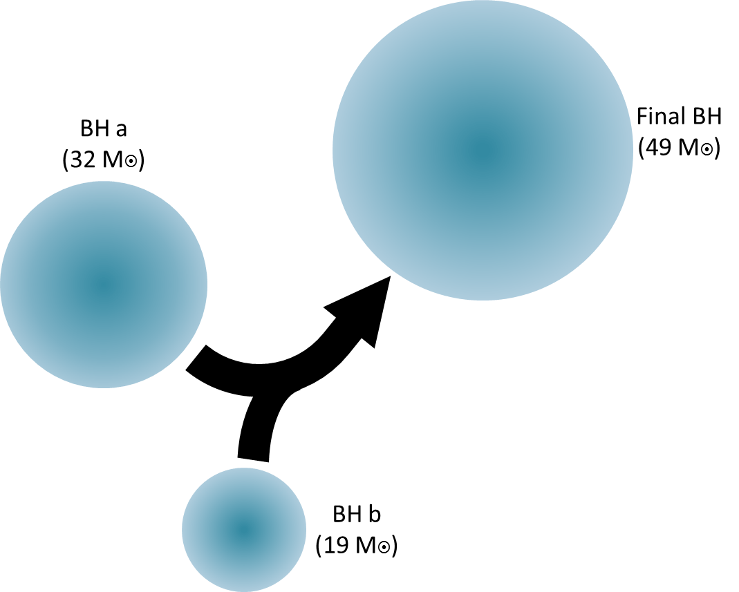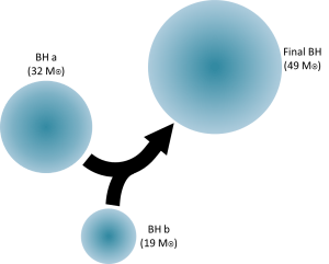 El 4 de enero de 2017, LIGO detectó dos agujeros negros que se fundiron en en uno. Uno de los agujeros negros fue de 32 veces la masa del Sol (32 M⊙, donde M representa la masa y ⊙ es un símbolo para el Sol) mientras que el otro era 19 veces la masa del Sol Cuando se combinaron, se creó un agujero negro de 49 veces la masa del Sol. La coalescencia convierte al instante 2 masas solares de la masa del agujero negro en la energía que sacudió el espacio-tiempo cantidad suficiente para generar las ondas gravitacionales que detectamos casi 3 mil millones de  años después de que ocurriera. Más información.Crédito: (Caltech / MIT / LIGO Lab).