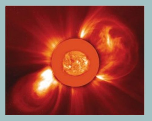 Figura 4. En esta imagen se muestran 2 EMC simétricamente opuestas. Las observaciones se realizaron el 8.Diciembre.2000 con la nave espacial SOHO, utilizando el coronógrafo LASCO-C2. Una imagen del EIT tomada el mismo día ha sido sobrepuesta en lo que sería el coronógrafo C2, el cual es usado para ocultar la luz fotosférica y poner así de manifiesto la débil señal coronal en luz blanca. (Solar & Heliospheric Observatory, SOHO).