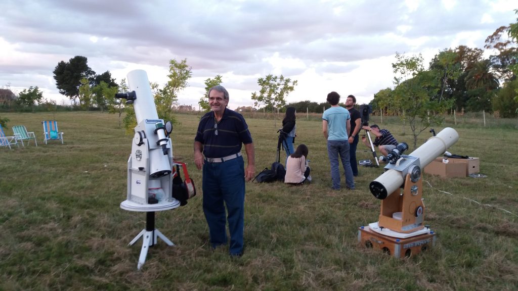 Jornada observacional de Otoño, el 25 de Marzo de 2017, en la Chacra del Profesor Antonio Labrador (Parador Tajes). Preparando los telescopios en el atardecer. Al frente, el especialista en instrumentos astronómicos José Pedro Malagrava, al centro, grupo de estudianetes de intercambio, detrás de ellos el Dr. Mario Manzanares agachado, trabajando en su telescopio. A pesar de que el cielo se ve nublado en la foto, los pronósticos no fallaron y sobre las 21 horas se despejó completamente. Crédito: AAA /Carlos Costa.