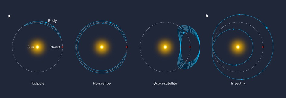 Cuando los cuerpos pequeños viajan a través del Sistema Solar, pueden entrar en estado co-orbital, en los que tienen el mismo periodo orbital que  un planeta. a_ Los cuerpos coorbitales  que giran alrededor del Sol en la misma dirección que un planeta pueden seguir trayectorias (curvas de color azul con flechas) que, desde el punto de vista del planeta (es decir lo que ve  un observador parado sobre el planeta mirando  la trayectoria del   cuerpo que lo co-orbita), se  parecen a un renacuajo (Tadpole),  una herradura (Horseshoe) o a un “cuasi-satélite (Quasi-satellite). El círculo blanco representa la órbita del planeta alrededor del Sol. Las formas de renacuajo y de herradura surgen debido a que la atracción gravitatoria del planeta  altera la trayectoria orbital del cuerpo – el cuerpo pasa por un ciclo de ponerse al día con el planeta y quedarse  atrás, pareciendo cambiar de dirección desde la perspectiva del planeta. La forma cuasi-satélite resulta cuando las dos órbitas tienen diferentes excentricidades. Cuando se ve desde el planeta, el cuerpo parece hacer un bucle alrededor de él. b_ Wiegert et al . 1 han descubierto el primer cuerpo co-orbital que gira alrededor del Sol en la dirección opuesta a un planeta. Cuando se ve desde el planeta, la órbita del cuerpo toma la forma de un tipo de curva llamada Trisectriz. Crédito:  Nature/ Helena Morais y Fathi Namouni.