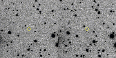 Con estas imágnenes  del asteroide 2015 BZ509, obtenidas en el Observatorio del Gran Telescopio Binocular ( Large Binocular Telescope Observatory (LBTO)) se estableció su naturaleza retrógrada co-orbital.  El LBTO tiene dos espejos de 8.4 metros de diámetro, uno al lado del otro y es por eso que tenemos las dos imágnenes. Las estrellas brillantes y el asteroide marcado con un círculo amarillo aparecen en color negro y el cielo en color blanco, en estas imágenes en negativo. ¿Qué son esos raros puntos, rayas y manchas  blancas en las imágenes? Ellas son  producidas por artefactos del sistema óptico en estas imágenes sin procesar. Agrandar imagen.