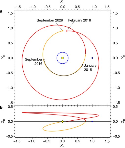 La trayectoria del asteroide 2015 BZ509 en el sistema de referencia que rota con Júpiter.  a_  El movimiento del asteroide visto desde arriba del plano de la órbita de Júpiter. Ver animación.  b_ El movimiento del asteroide visto de costado respecto del plano de la órbita de Júpiter. Ver animación. Crédito: Nature/ Paul Wiegert, Martin Connors & Christian Veillet.