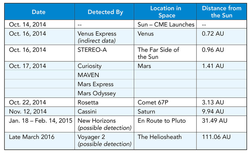 Siete naves espaciales de la NASA y la ESA realizaron detecciones directas y confirmadas de la misma EMC, que salió desde el Sol el 14 de Octubre de 2014.