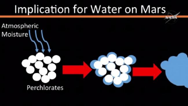 Las condiciones atmosféricas en Marte permiten que las sales de perclorato existentes en el suelo marciano pueden absorber agua de la atmósfera, el proceso de delicuescencia, proceso mediante el cual una sustancia absorbe la humedad de la atmósfera hasta que se disuelve en el agua absorbida y forma una solución. Crédito: NASA.
