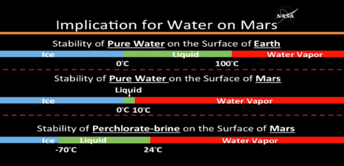 La figura muestra cómo los percloratos amplían el rango de temperatura de estabilidad del agua líquida en la superficie marciana en ambas direcciones, hacia temperaturas muy frías como hacia tempraturas cálidas. Aunque a las temperaturas cálidas allí se evaporaría rápidamente. Crédito: NASA.