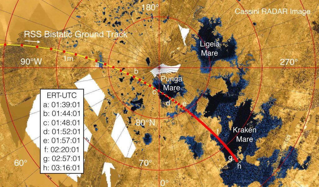 Se muestra arriba un mapa de radar coloreado de la Cassini de los lagos y mares del norte de Titán. La línea amarilla con puntos rojos muestra el camino a través de Titán que el instrumento de radio de Cassini apuntó durante el sobrevuelo T-124 el 13 de Noviembre de 2016.. Las etiquetas con letras corresponden a los Tiempos de recepción de la Tierra (ERT) para la señal de radio, enumerados en el cuadro blanco en Tiempo universal coordinado (UTC). Crédito: NASA /JPL /Calthec /Cassini Legacy. Más información