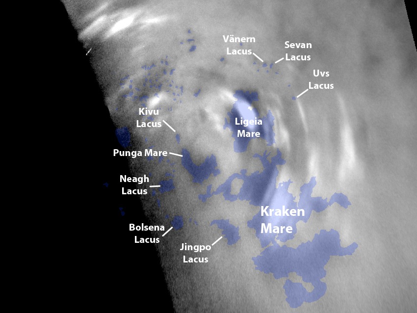 Los grandes lagos y mares de metano cerca del Polo Norte de Titán, la luna de Saturno. Ver película del movimiento de las nubes en esa región, hecha a partir de imágenes tomadas por la nave espacial Cassini de la NASA. Crédito de la imagen: NASA / JPL / SSI . Más información.