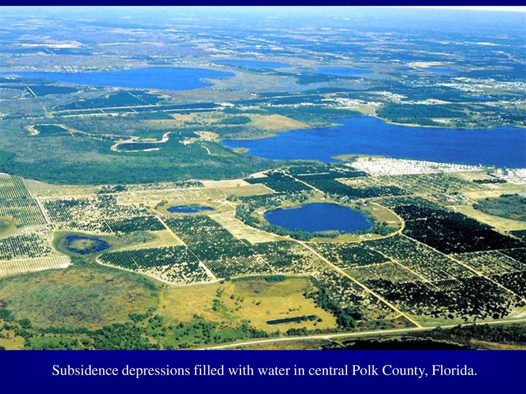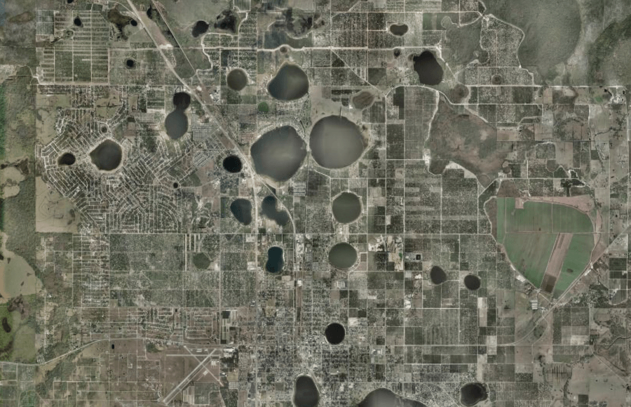 Muchos de los numerosos estanques y lagos que salpican el paisaje de Florida, como estos en el Condado de Polk, son en realidad hundimientos del terreno rellenos de agua. Crédito:Sinkhole.org. Más información.