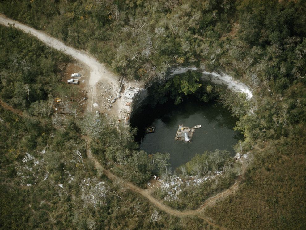 Una draga se encuentra en el centro de este antiguo cenote o sumidero, cerca de Chichén Itzá, México. Los cenotes son formaciones comunes en paisajes kársticos. A medida que la piedra caliza que forma el lecho rocoso de la zona se erosiona, forma cuevas y sumideros donde se acumula agua dulce. Obsérvese que los bordes del cenote están a nivel del suelo y no sobre él. Crédito: National Geographic / Fotografía de Bates Littlehales. Más información.