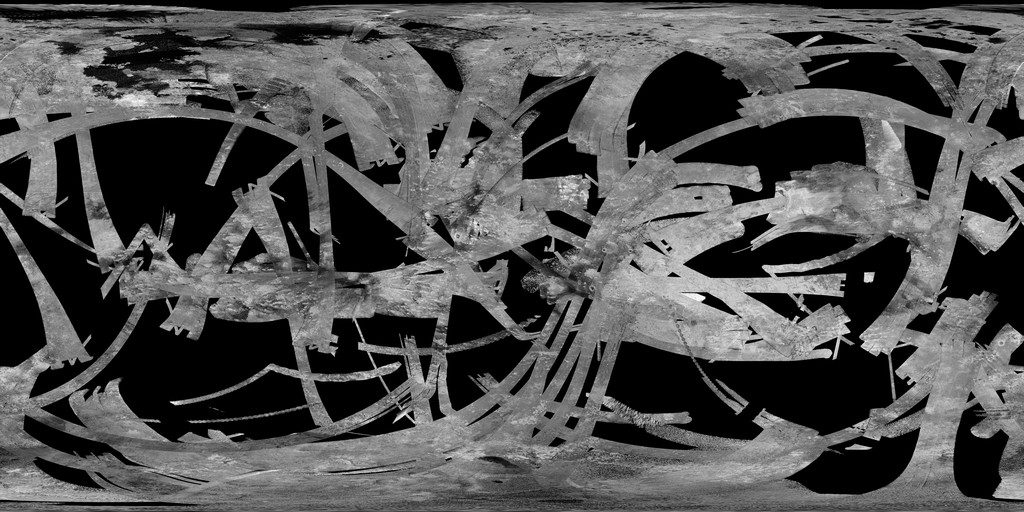Mosaico Global de Titan obtenido con los instrumentos SAR, HiSAR de Cassini 351m T104. Mapa global de la superficie de Titán que muestra la cobertura derivada de Radar de apertura sintética (SAR) e imágenes de Radar de apertura sintética a gran altitud (HiSAR). Este mosaico combina el flyby T104 de Cassini en un sólo mosaico. Este es un producto preliminar. Crédito: Jet Propulsion Laboratory, USGS Astrogeology Science Center. January 1, 2015. Más información.