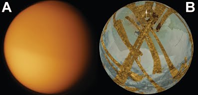 La imagen es una comparación entre las imágenes de Titán tomadas por la nave Voyager (A) y por Cassini (B). La imagen del Voyager sólo observó una atmósfera naranja opaca de neblina de hidrocarburo. La imagen de Cassini incluye imágenes SAR de alta resolución superpuestas sobre mosaicos infrarrojos de baja resolución de los instrumentos ISS y VIMS.