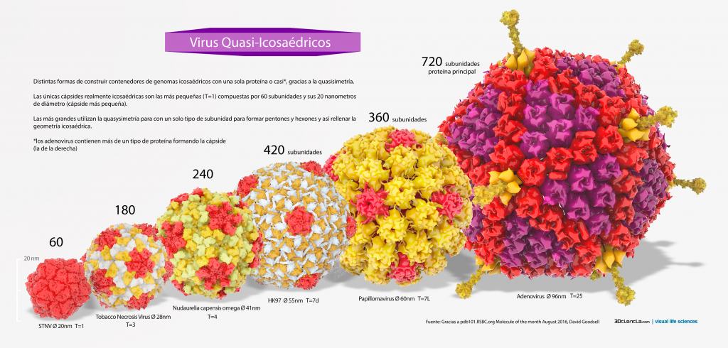 Cápsides de virus icosaédricos. En la figura se muestran ejemplos tipo de cápsides icosaédricas virales y su simetría en cada una de ellas*, están compuestas por la repetición de una única proteína que con ligeras variaciones es capaz de formar pentones y hexones y rellenar la geometría icosaérica. De menor a mayor Virus satélite del virus de la necrosis del tabaco STNV, virus de la necrosis del tabaco TNV, Nudaurelia capensis omega virus, virus HK97, papilomavirus humano, Adenovirus. Este último rellena la geometría con más de un tipo de proteína pero principalmente repite una 720 veces. Fuente: Gracias a pdb101.RSBC.org Molecule of the month August 2016, David Goodsell. Credit: 3Dciencia.com