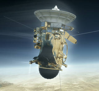 A la derecha: Representación artística de la nave espacial Cassini de la NASA , al sumergirse en la atmósfera de Saturno el 15 de Septiembre de 2017. Créditos: NASA / JPL-Caltech.