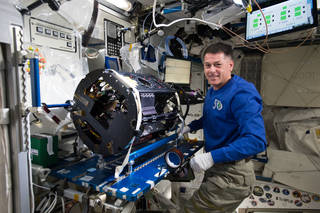 A la derecha: El Aparato de Combustión de Gotitas Multiusuario (MDCA) se adaptó a las investigaciones de combustión de gotitas que estudiaban la eficiencia del combustible y la producción de motores en el espacio y en la Tierra. El astronauta de la NASA Shane Kimbrough reconfigura el MDCA para la Investigación de Llamas Frías (Cool Flames Investigation) durante la Expedition 50. Crédito: NASA.