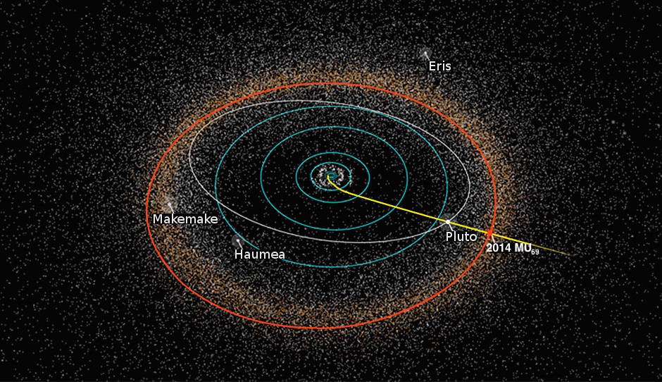 Trayectoria de la nave New Horizons enn color amarillo; en naranja la órbita de 2014 MU69. Créditos: NASA/Johns Hopkins University Applied Physics Laboratory/Southwest Research Institute/Alex Parker.